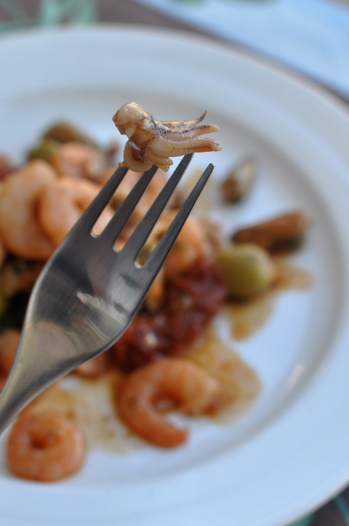 Hotový salát - ready to eat - si doma naservíruju s kouskem bílího pečiva v ruce jedné, a sklenkou vychlazeného bílého nebo růžového vína v ruce druhé. Nebylo by od věci, kdybych přidala pár lístků zeleného salátu, pokapaných citrónovou šťávou. Další variantou může být krátké prohřátí - lehké prohození na pánvi - a podávání s čerstvě uvařenými italskými těstovinami nebo rizotem. Právě této variability chtěl Milan Pospíšil - kapitán Přístavu Valnovka - dosáhnout, když vymýšlel svou recepturu. A já si frutti di mare patřičně užívám: mušle,
